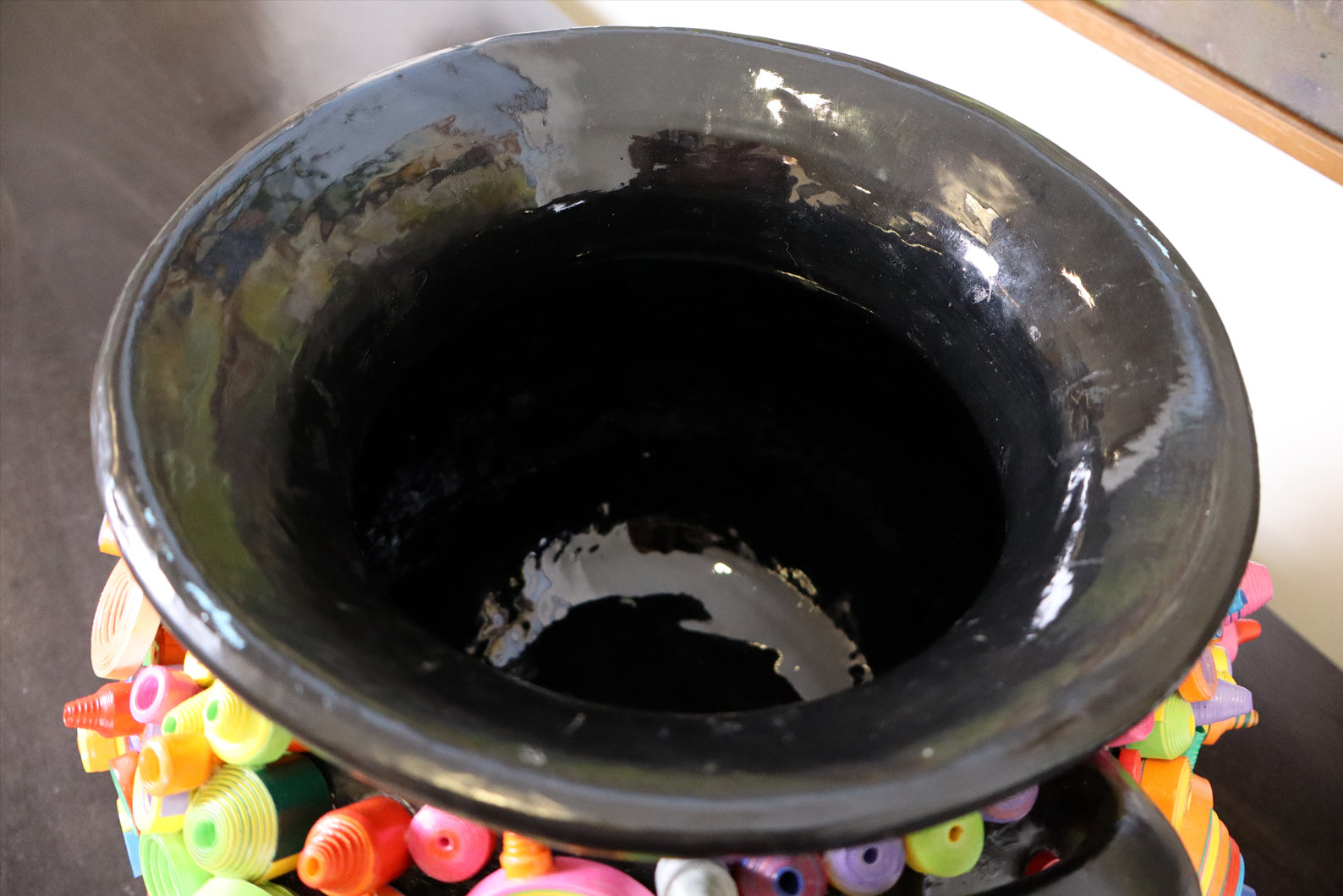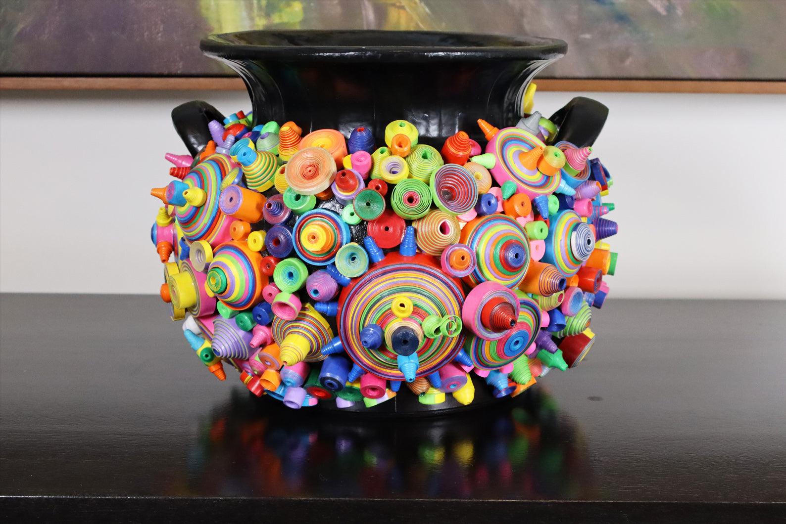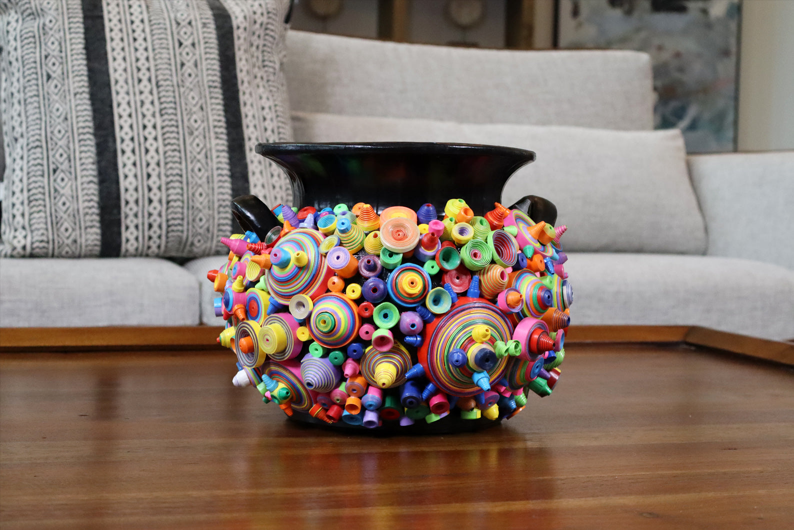 Sculptural black pottery made from rolled and hand-shaped strips of paper.